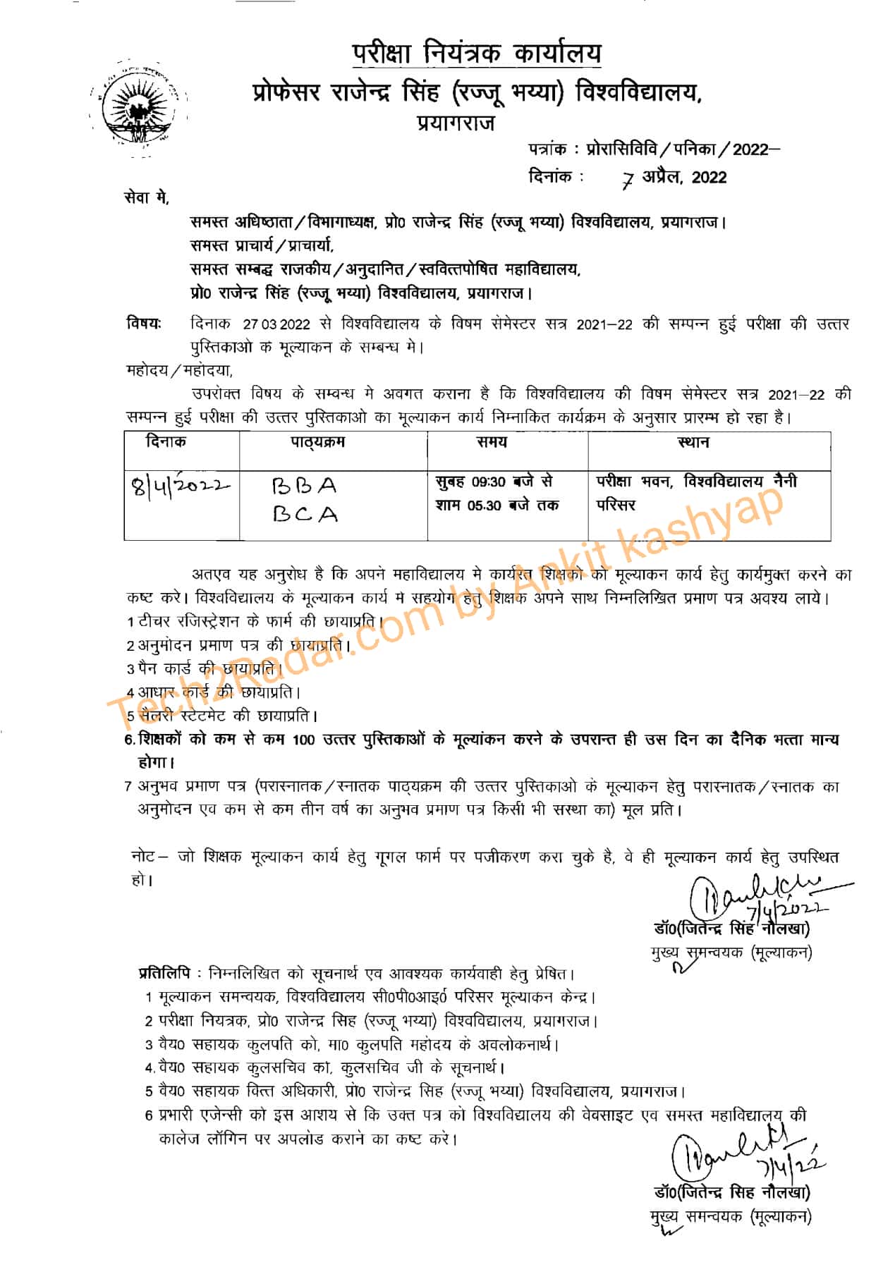 allahabad state university की ताज़ा अपडेट न्यूज़ है की प्रो. राजेंद्र सिंह (रज्जू भैया) विश्वविद्यालय, प्रयागराज के BBA और BCA कोर्स के विषम सेमेस्टर सत्र 2021-2022 में सम्पन्न हुई परीक्षा की उत्तर पुस्तिका का मूल्यांकन कार्य 8 अप्रैल 2022 से शुरू किया जा चूका है। यह जानकारी राजेंद्र सिंह (रज्जू भैया) विश्वविद्यालय, प्रयागराज की ऑफिसियल नोटिफिकेशन से ७ अप्रैल को मिली |